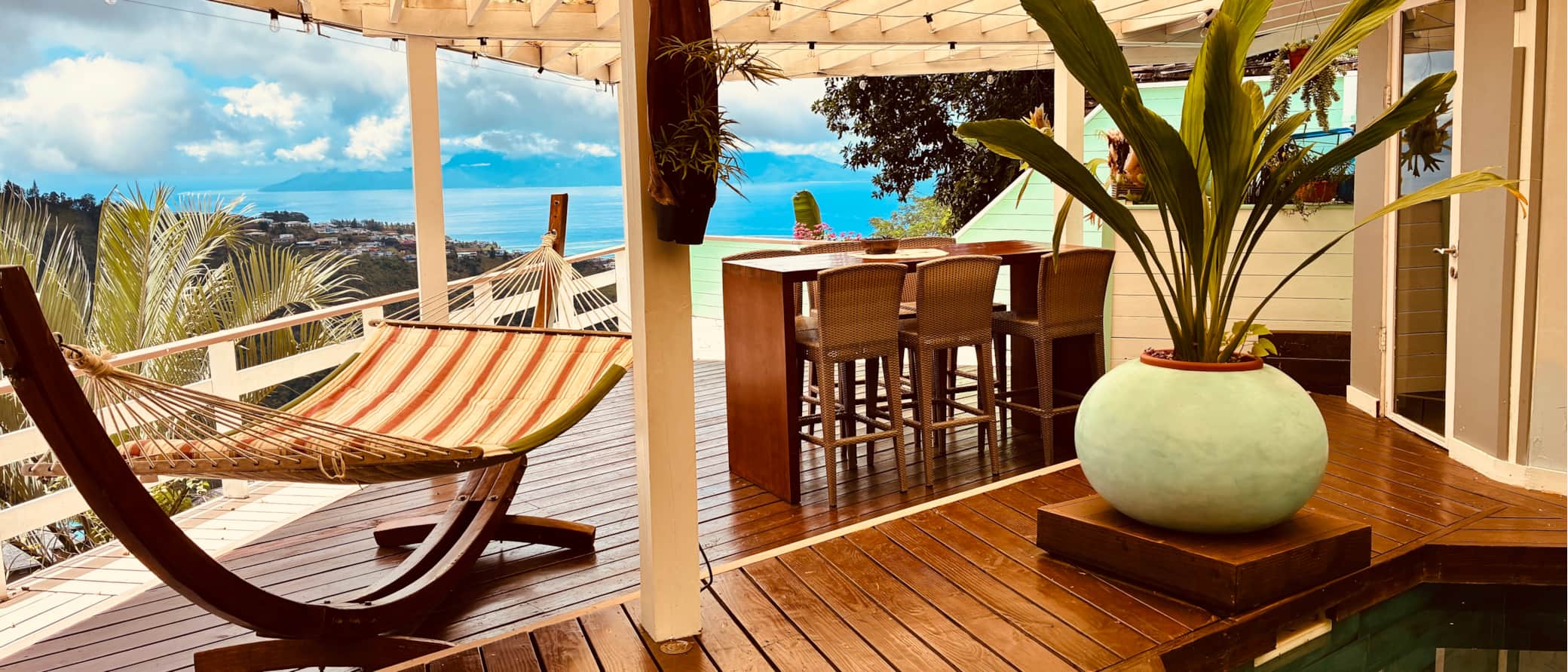 Sur l'île de Tahiti, à 400 mètres d’altitude, le Fare Maiao vous offre un vrai refuge au calme, avec une vue spectaculaire sur l’océan. Profitez de l'intimité de nos deux bungalows et du confort des espaces partagés.